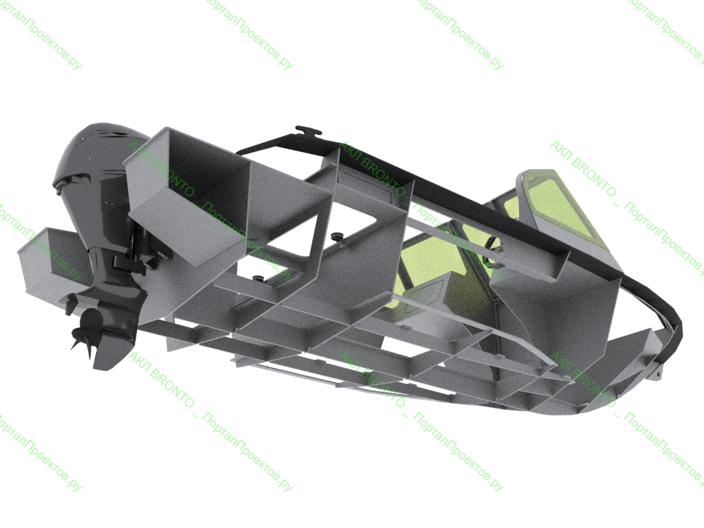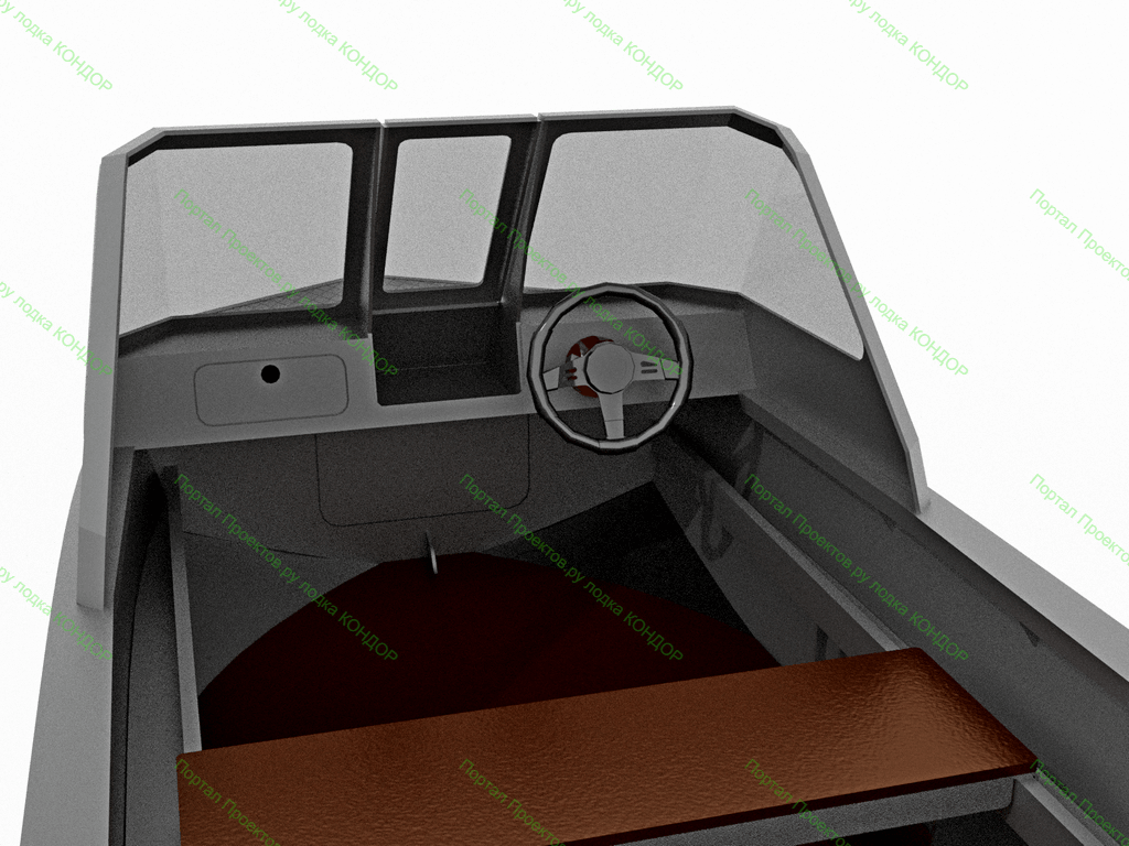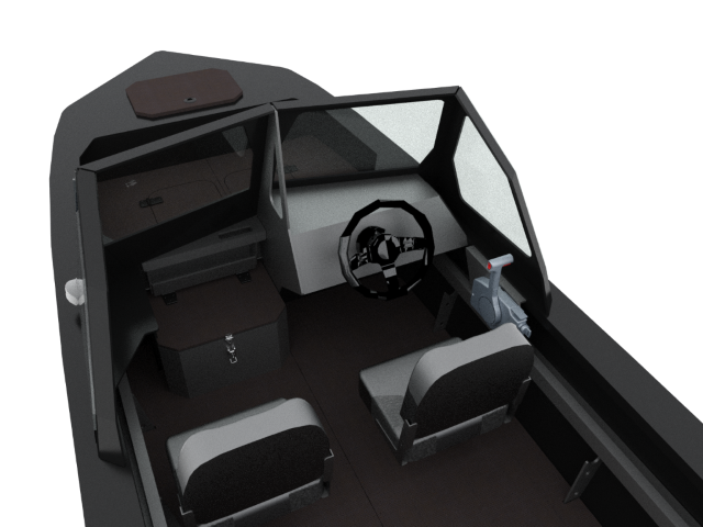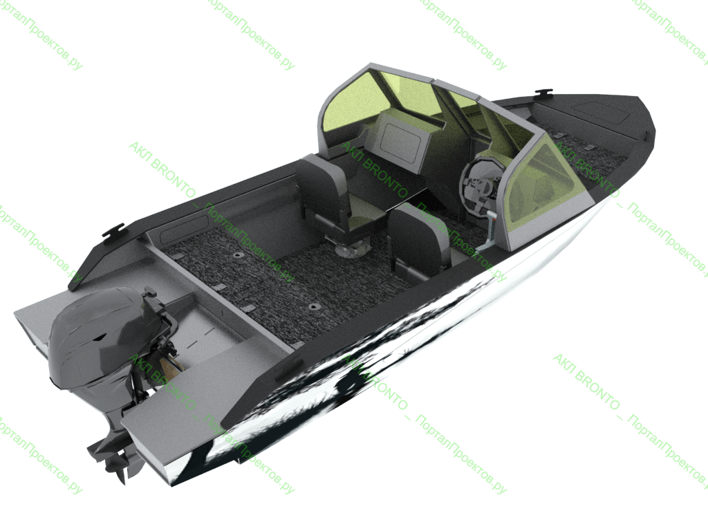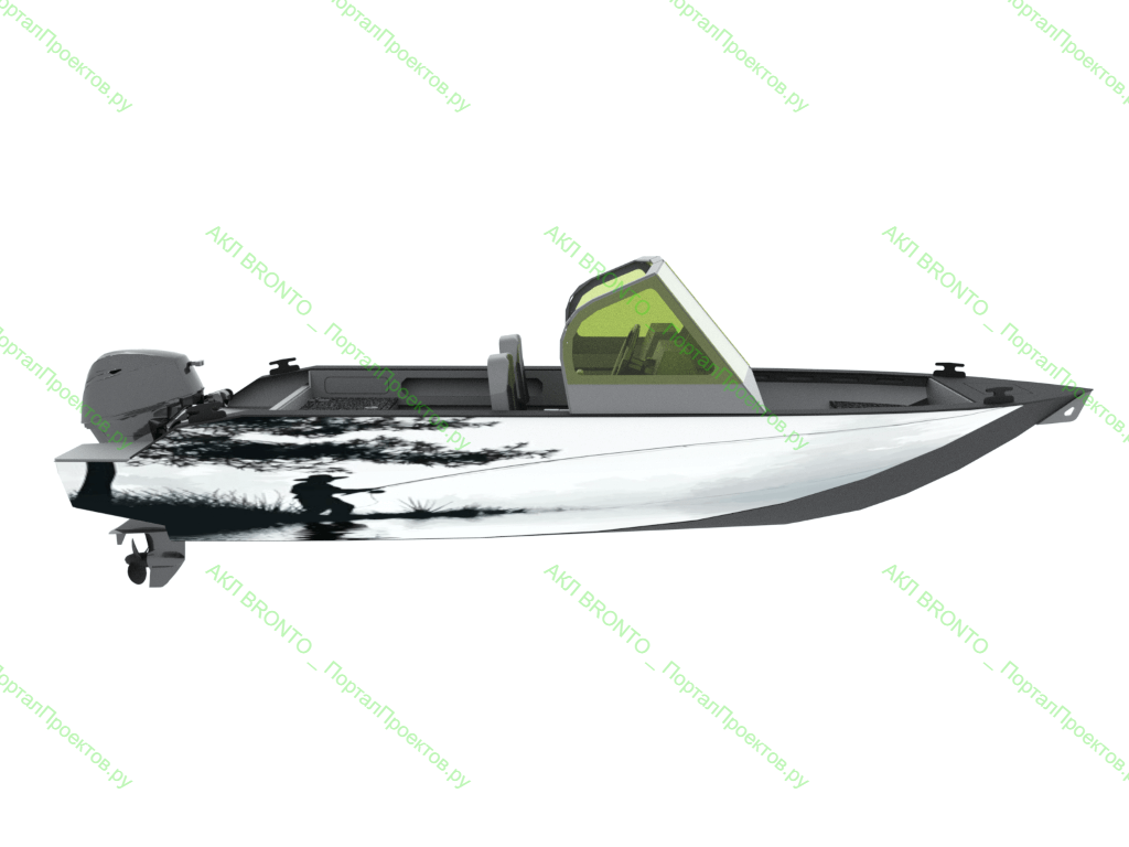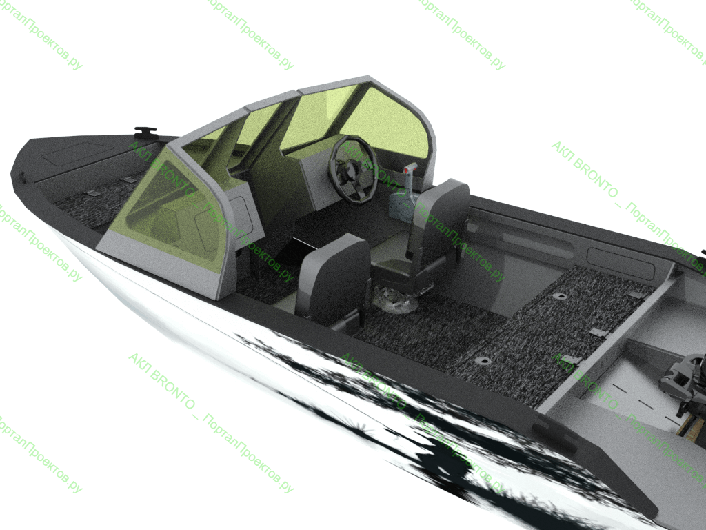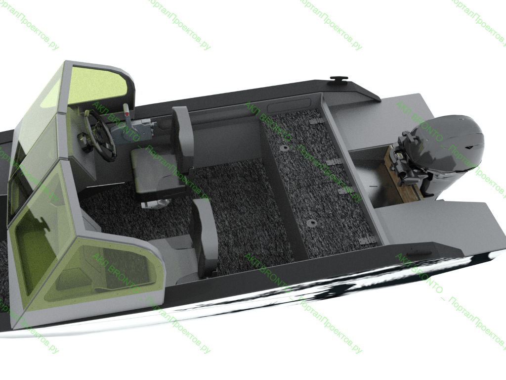 Разметка на бортах и днище для позиционирования. Левое остекление открывное. Фиш-палуба носовая и кормовой диван с комингсами - сухие рундуки. Рундук-ступенька для АКБ. Продольные полки и кронштейны под спиннинги либо весла.