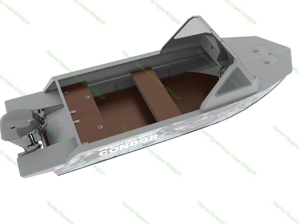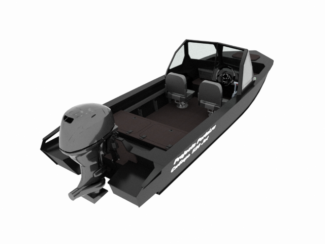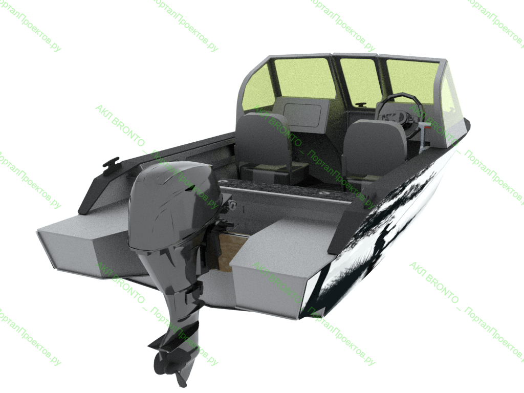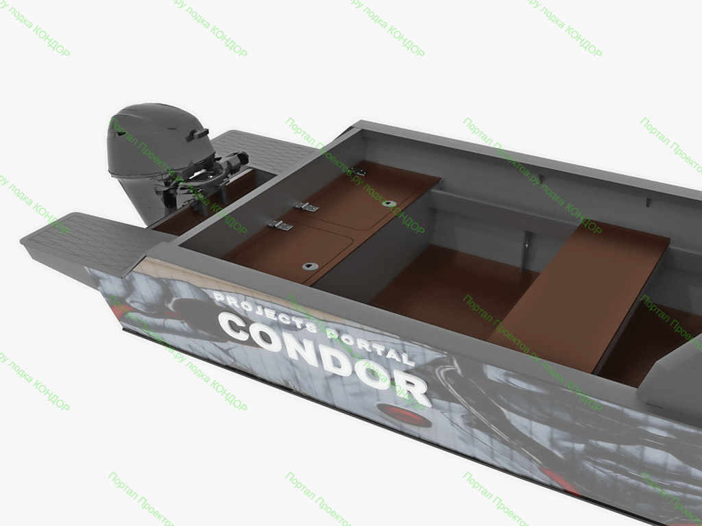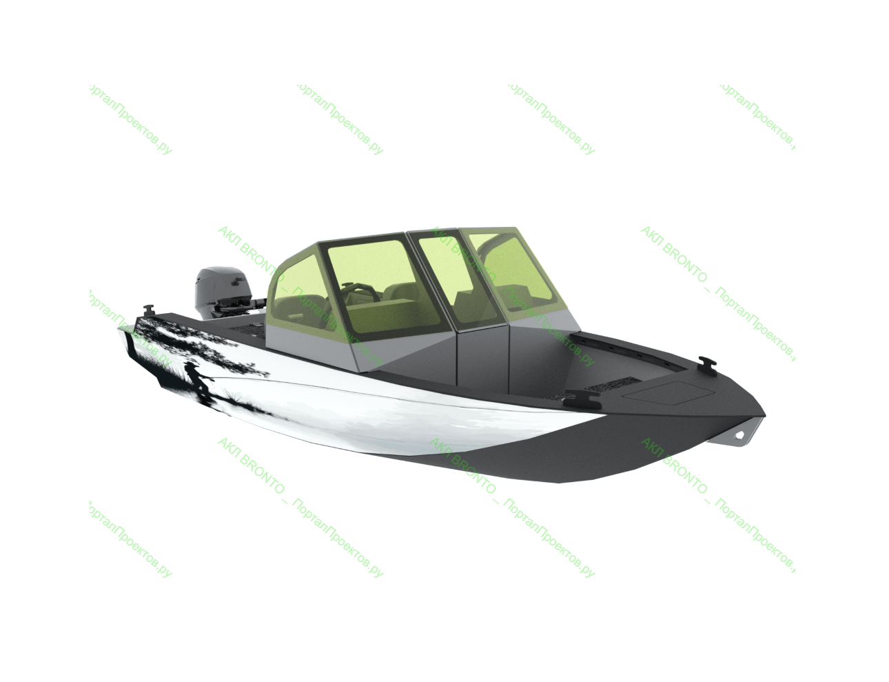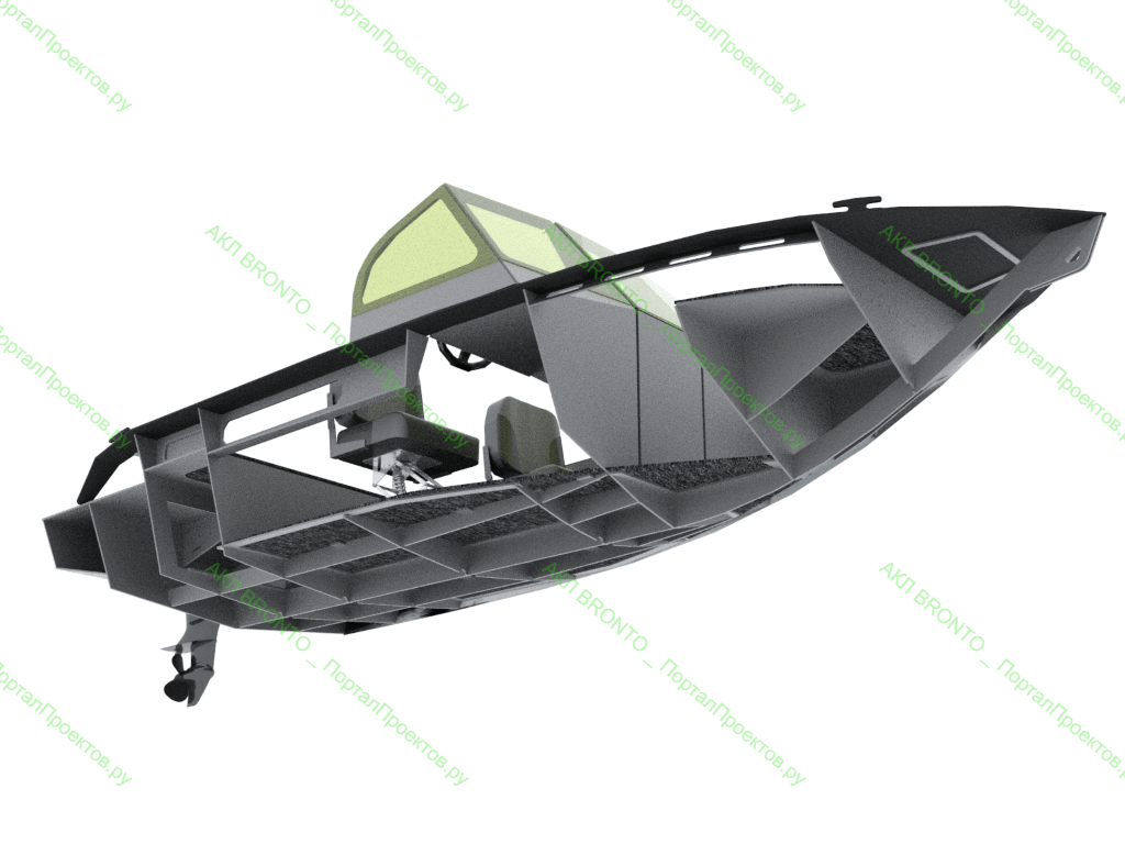 Разметка на бортах и днище для позиционирования. Левое остекление открывное. Фиш-палуба носовая и кормовой диван с комингсами - сухие рундуки. Рундук-ступенька для АКБ. Продольные полки и кронштейны под спиннинги либо весла.